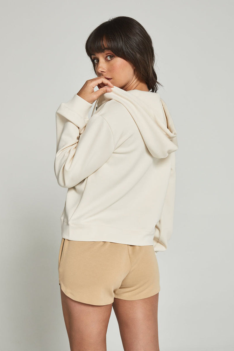 A full-zip hoodie with a buttery-soft modal fabrication. Wear over a basic or by itself and complete the look with joggers or biker shorts.