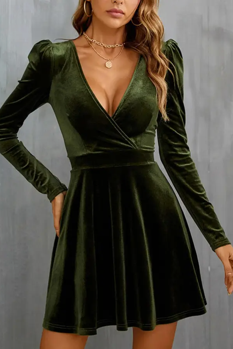 Elevate your evening wardrobe with this stunning velvet cocktail dress featuring a flattering V-neckline and distinctive leg-of-mutton sleeves that add timeless sophistication. The graceful A-line silhouette skims your curves while the luxurious velvet fabric drapes beautifully, creating an elegant statement piece perfect for cocktail parties, holiday gatherings, or special occasions. The rich army green hue offers a refined alternative to traditional black, ensuring you'll stand out with understated glamour. Versatile enough to dress up or down, this NINEXIS design combines classic tailoring with modern style for a look that turns heads.