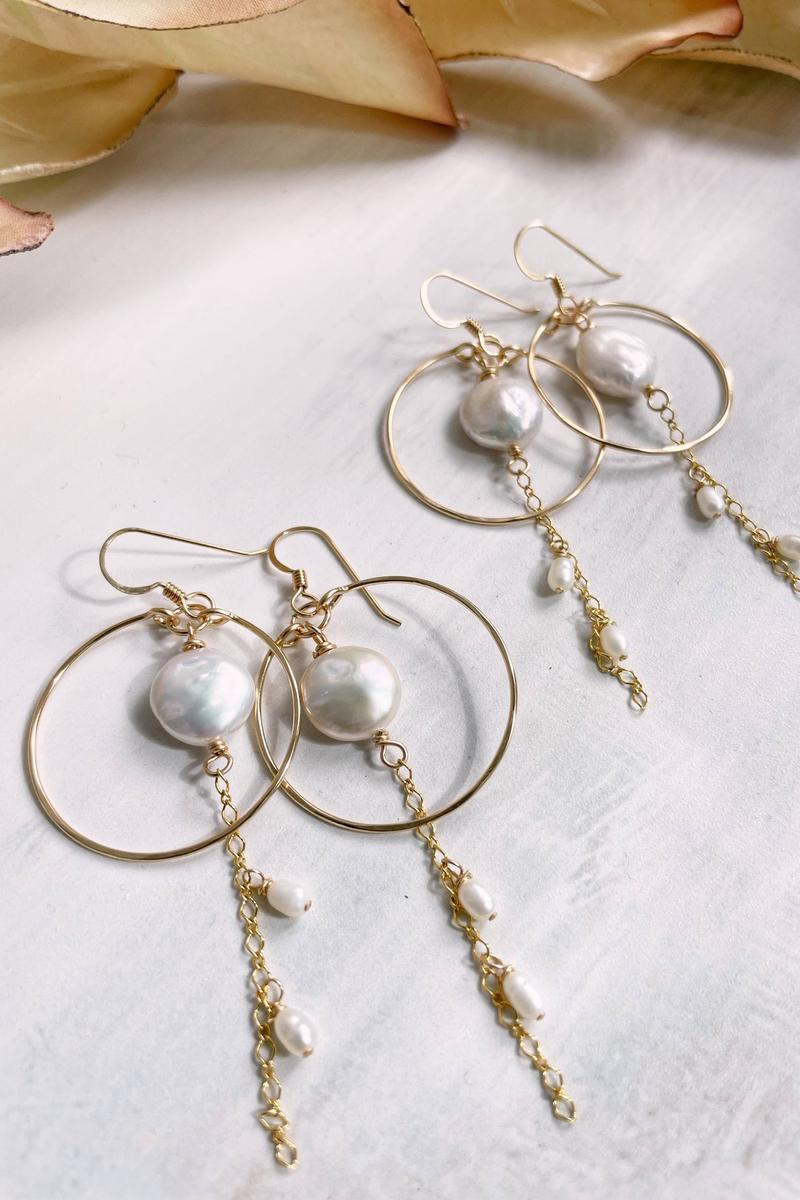 Quinn Sharp - Freshwater Pearl Coin Chain Dangle Hoops | 14kt Gold Filled
