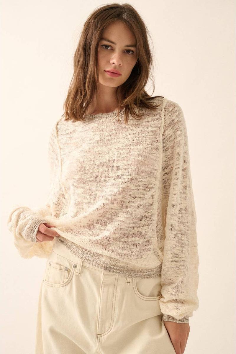 Effortlessly chic, the Promesa Sweater combines relaxed comfort with understated elegance. This semi-sheer burnout knit features a flattering boat neckline and flowing dolman sleeves that move with you throughout your day. Ribbed detailing at the collar, cuffs, and hem provides structure and polish, while the loose fit ensures all-day wearability. Perfect for layering or wearing solo, this cream-colored essential transitions seamlessly from casual to polished occasions.