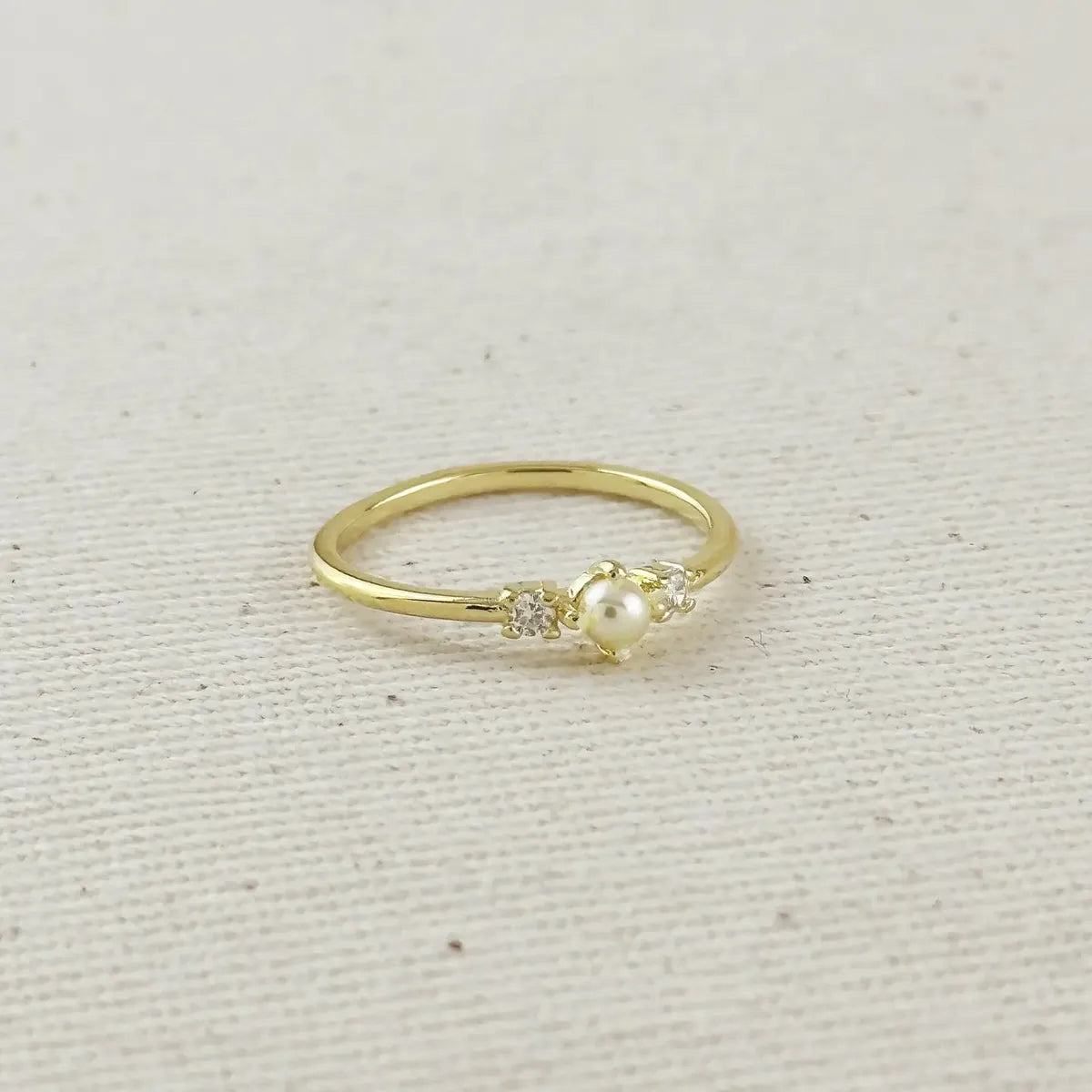 Elegant & Timeless Design. This sophisticated ring blends classic beauty with modern charm. Crafted in 18k gold-filled metal, it features a luminous synthetic pearl flanked by two sparkling AAAAA CZ stones in a timeless three-stone setting.
