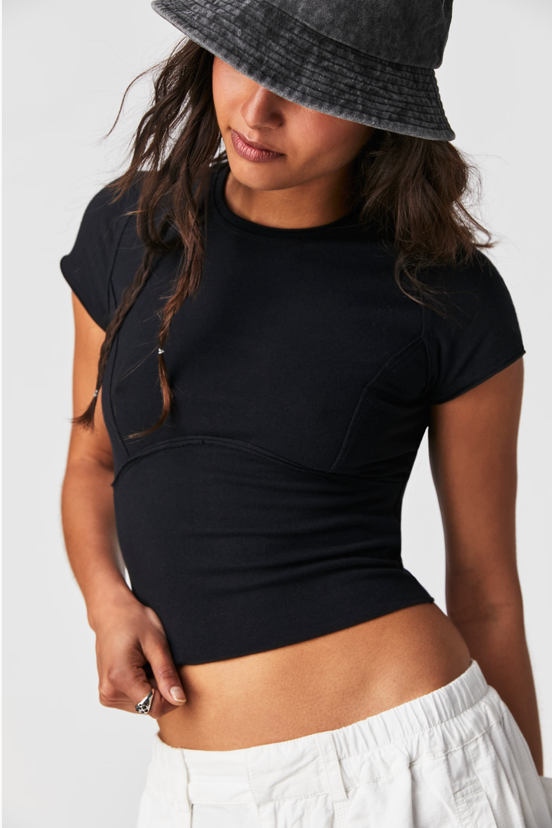 Elevate your wardrobe with the Free People Protagonist Tee! The vintage-inspired design features exaggerated seaming, capped sleeves, and tapered bottom for a flattering cropped silhouette. Perfect for effortless style and added shape.