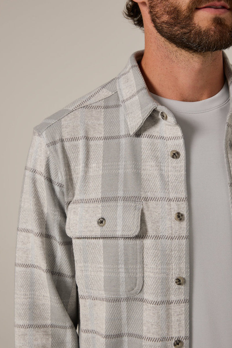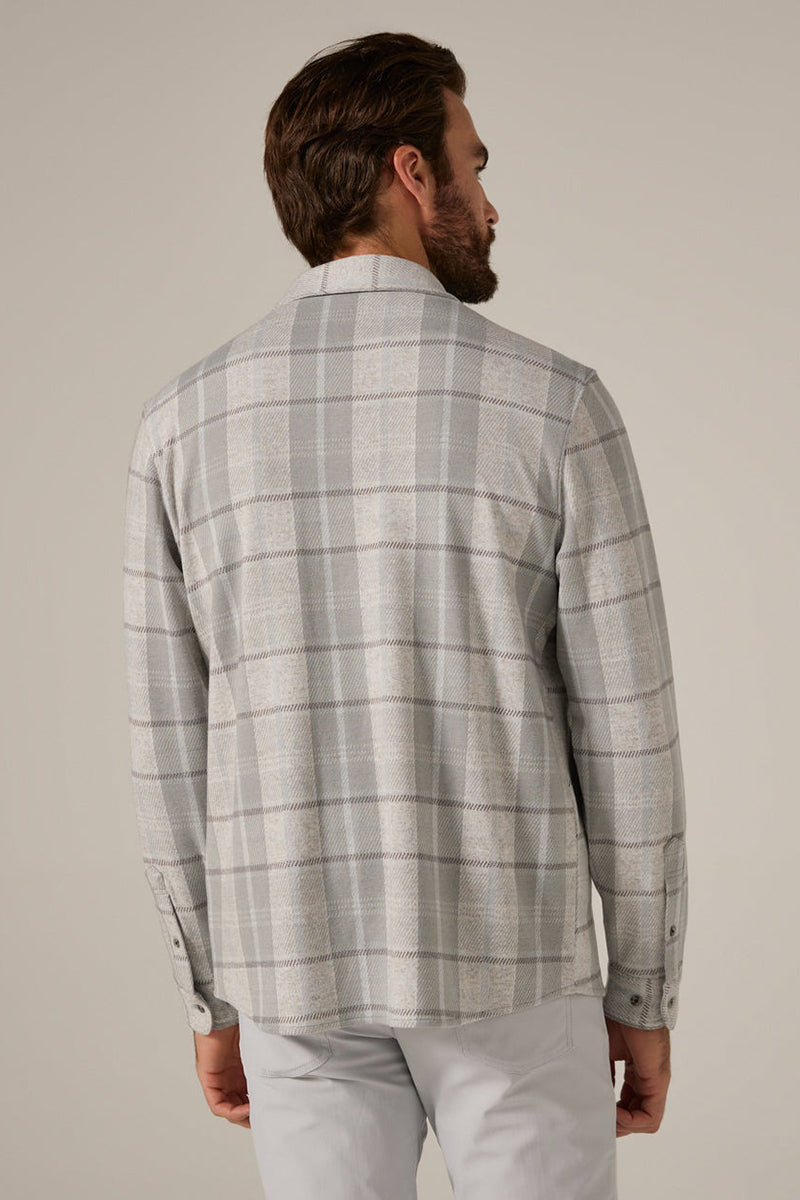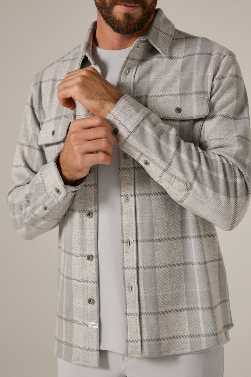 Experience unmatched comfort and style with the 7DIAMONDS Generation™ Plaid Shirt in Sage. Crafted from soft-touch double-knit jacquard fabric, it offers 4-way stretch to move with you all day. Featuring a refined designer plaid, chest flap pockets, faux-horn buttons, and a curved hem, this shirt delivers a polished, tailored appearance perfect for any occasion.