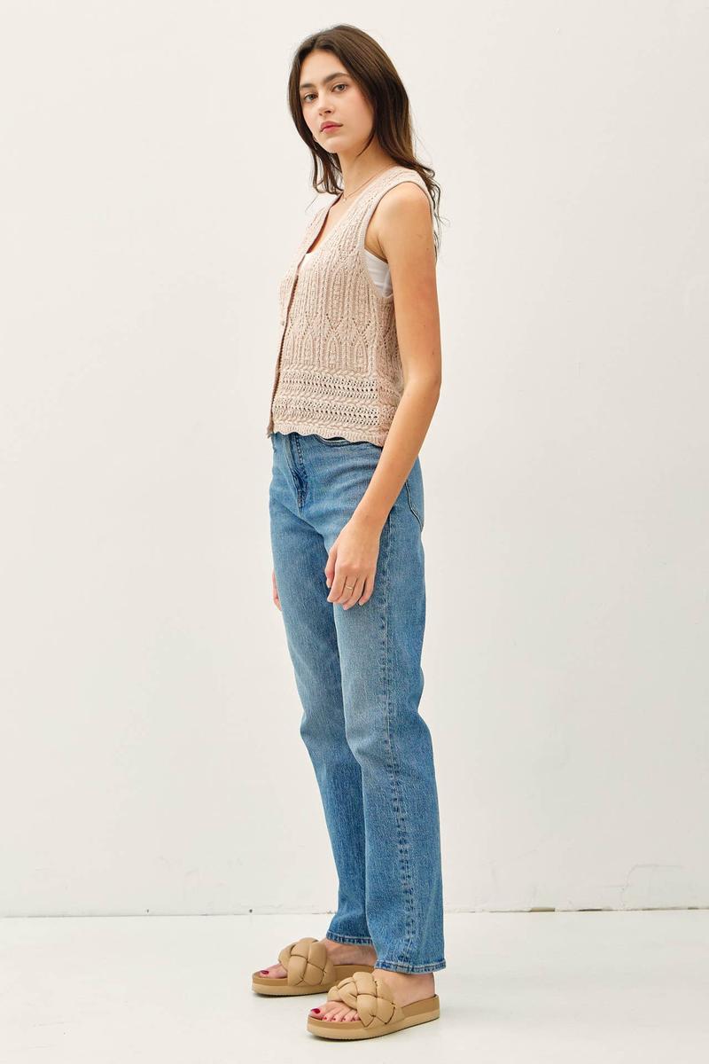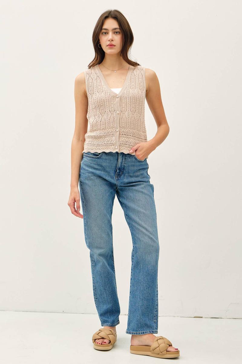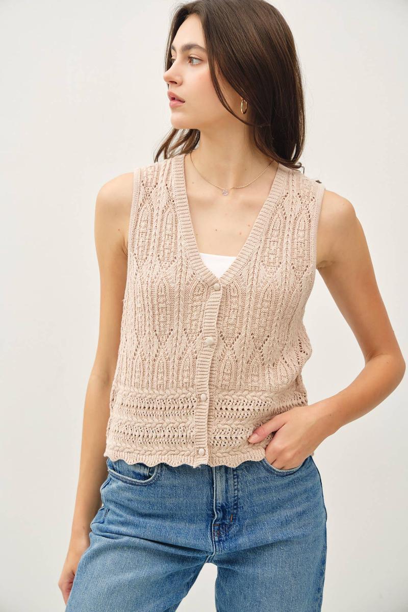Stay effortlessly stylish with the Be Cool Crochet Knit Sweater Vest in Taupe. This lightweight, button-up tank features a flattering V-neck and delicate crochet knit details, crafted from 100% breathable cotton. Perfect for layering in spring, summer, or fall, it adds a chic touch to any outfit while keeping you comfortable all day long.