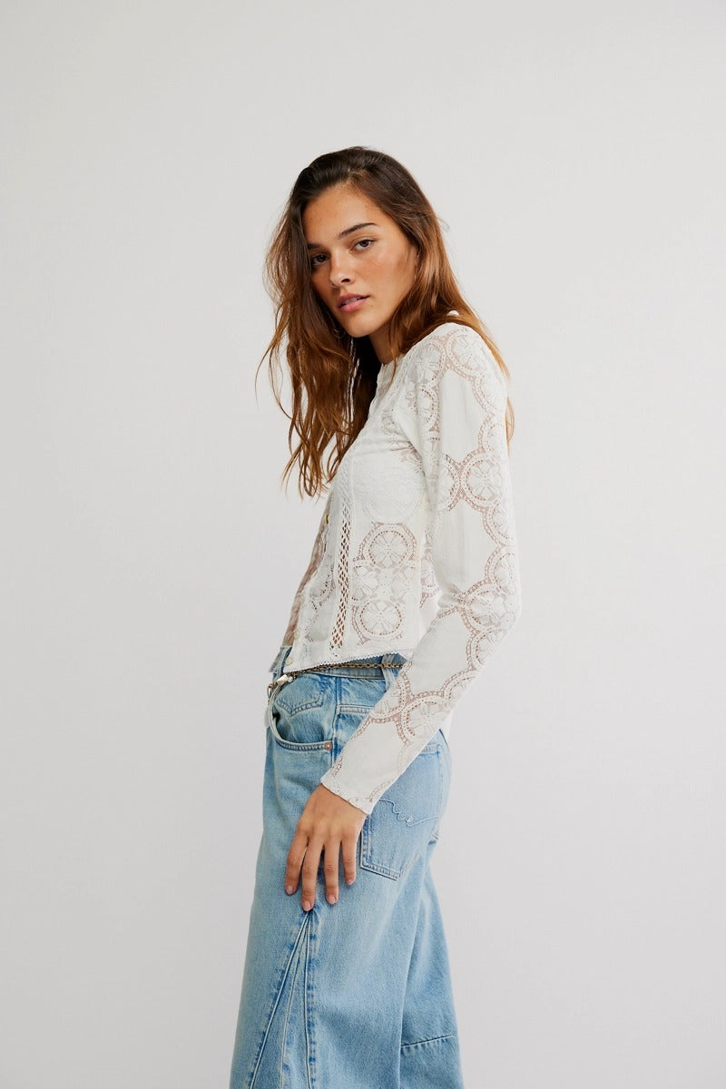 Elevate your wardrobe with the Free People Jae Knit Long Sleeve in Sugar Swizzle. This delicate sheer cotton-lace top features a flattering crew neckline and button-front closure, offering effortless versatility for layering. Fitted long sleeves add a refined silhouette, while its unlined design ensures breathability and comfort. Perfect for adding a subtle, feminine touch to any outfit.