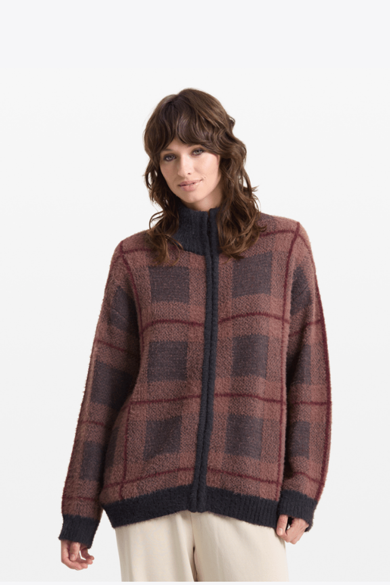 Stay warm and stylish with the Volcom She's Stone Cozy Sweater in Brownstone. This oversized plaid sweater features a mock neck and a convenient zipper closure, offering both comfort and easy wear. Its relaxed fit and classic pattern make it perfect for layering on chilly days, while the soft fabric ensures lasting coziness. Elevate your casual wardrobe with this versatile, effortlessly cool piece.